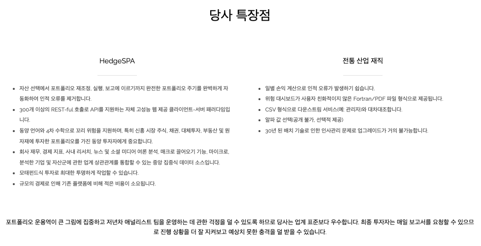 - 개인 자산 운용사: 우리는 강력한 투자 실적을 구축하기 위해 가장 큰 자산 운용사(일부는 보험 회사와 관련이 있으므로 ALM 각도)와 협력합니다.